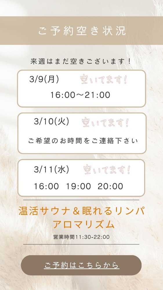 🍀空きがある日ですご希望の時間をLINEでご連絡下さい確認次第LINEさせて頂きますのでそれまで少しお待ちください🍀AM 11時半から最終20時まで下のご予約ボタンかLINEからご希望の日時のご連絡をお待ちしています😊当日のご予約はLINEからご連絡がおすすめですキャンセルなどもありご予約可能になっている場合もありますLINEから確認の連絡もお気軽にどうぞ^_^💚那覇市古島 なは市立病院近く